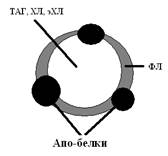 Триглицериды, фосфолипиды, ХС практически не растворимы в воде, в связи с чем они не могут транспортироваться кровью или лимфой в виде одиночных молекул. Перенос всех этих соединений осуществляется в виде особым образом организованных надмолекулярных агрегатов -липопротеидных комплексов или просто липопротеидов. Поверхность частицы составляют фосфолипиды, холестерин и особые белки. Большая часть белков представлена гликопротеином – аполипопротеином В. Приставка «апо» означает белок входящий в состав липопротеина. Сердцевина хиломикрона (гидрофобная часть) состоит из триглицеридов и эфиров холестерина. Хиломикроны поступают в лимфу и по грудному лимфотическому протоку попадают в кровь. В состав липопротеидов входят молекулы липидов различных классов и молекулы белков. Все липопротеиды имеют общий план структуры: амфифильные молекулы белков, фосфолипидов и свободного ХС образуют наружную мономолекулярную оболочку частицы, в которой гидрофильные части молекул этих соединений направлены кнаружи и контактируют с водой, а гидрофобные части молекул обращены вовнутрь частиц, участвуя в образовании гидрофобного ядра частицы. В состав гидрофобного ядра липопротеидов входят триглицериды и эстерифицированный ХС, сюда же могут включаться другие гидрофобные молекулы, например, молекулы жирорастворимых витаминов. Существует несколько классов липопротеидных частиц, отличающихся друг от друга по составу, плавучей плотности и электрофоретической подвижности: хиломикроны (ХМ), липопротеиды очень низкой плотности (ЛПОНП), липопротеиды низкой плотности (ЛПНП), липопротеиды высокой плотности (ЛПВП) и некоторые другие. В транспорте экзогенных липидов, т.е. липидов, поступающих во внутреннюю среду организма из кишечника, принимают участие главным образом ХМ и ЛПОНП. Состав хиломикронов (ХМ) и липопротеидов очень низкой очень низкой плотности (ЛПОНП) в % от массы частиц. Ведущую роль в транспорте экзогенных липидов играют ХМ, поэтому мы остановимся пока только на их метаболизме. ХМ поступают в лимфатическую систему, а затем вместе с лимфой поступают в кровь и попадают вместе с током крови в капилляры различных органов и тканей. На поверхности эндотелия капилляров имеется фермент липопротеидлипаза, закрепленная там с помощью гепарансульфата. Липопротеидлипаза расщепляет триглицериды хиломикронов до глицерина и высших жирных кислот. Часть ВЖК поступает в клетки, другая их часть связывается с альбуминами и уносится током крови в другие ткани. Глицерин также может или утилизироваться непосредственно в клетках данного органа, или уносится током крови. Кроме триглицеридов и хиломикронов, липопротеидлипаза способна гидролизовать триглицериды ЛПОНП. Интересно, что липопротеидлипаза в капиллярах различных органов обладает различным сродством к триглицеридам ХМ и ЛПОНП. Например, сродство липопротеидлипазы капилляров миокарда к триглицеридам этих липопротеидов значительно выше, чем у липопротеидлипазы липоцитов. Поэтому в постабсорбционный период и при голодании, когда содержание ЛП-частиц в крови снижается, липопротеидлипаза капилляров миокарда остается насыщенной субстратом, тогда как гидролиз триглицеридов в жировой ткани практически прекращается. ХМ, потеряв большую часть своих триглицеридов под действием липо
