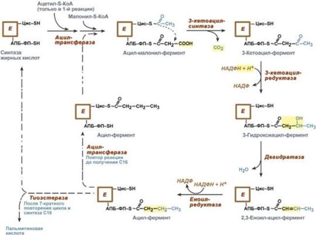 В первых двух реакциях последовательно присоединяются малонил-SКоА к фосфопантетеину ацил-переносящего белка и ацетил-SКоА к цистеину 3-кетоацилсинтазы. 3-Кетоацилсинтаза катализирует третью реакцию – перенос ацетильной группы на С2 малонила с отщеплением карбоксильной группы. Далее кетогруппа в реакциях восстановления (3-кетоацил-редуктаза), дегидратации (дегидратаза) и опять восстановления (еноил-редуктаза) превращается в метиленовую с образованием насыщенного ацила, связанного с фосфопантетеином. Ацилтрансфераза переносит полученный ацил на цистеин 3-кетоацил-синтазы, к фосфопантетеину присоединяется малонил-SКоА и цикл повторяется 7 раз до образования остатка пальмитиновой кислоты. После этого пальмитиновая кислота отщепляется шестым ферментом комплекса тиоэстеразой.