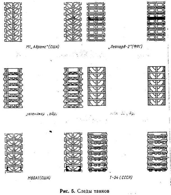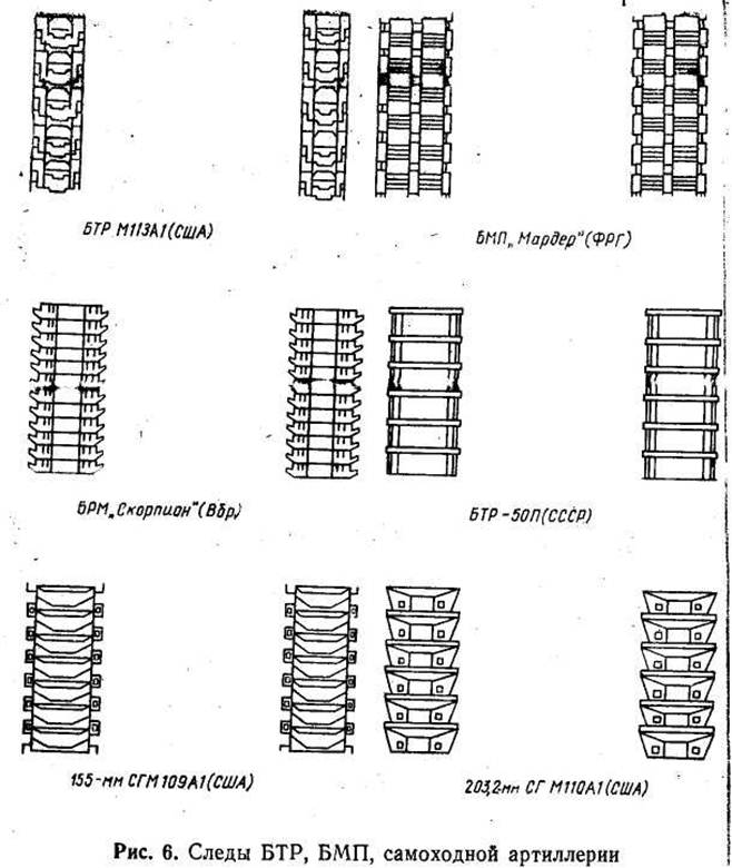 моральном состоянии воинской части, ослаблении в ней дисциплины и изнурении войск. Строгая разбивка лагеря (бивака), порядок на оставленном месте, отсутствие предметов снаряжения, обмундирования или вооружения показывают, что отдыхавшие войска были в хорошем состоянии. При изучении следов необходимо уметь определить вид и количество боевой техники (транспорта), направление движения и давность следа. Вид боевой техники по ее следу определить несложно, зная основные характеристики гусеничного движителя: ширину колеи и гусеницы (табл. 2) и характер рисунка гусеничного звена (рис. 5 и 6). Для Таблица 2 Date: 2015-04-23; view: 659; Нарушение авторских прав |