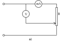 а) метод точного измерения тока б) методу точного измерения напряжения Рисунок 1 Схемы подключения измерительных приборов Измерение активного сопротивления по методу точного измерения тока (рисунок 1а) Ток Ј через исследуемое сопротивление измеряется миллиамперметром mA. Вольтметр V измеряет падение напряжения на миллиамперметре, внутреннее сопротивление которого R= 0,29 Ом, и сопротивление R в соответствии с формулой u=Ј∙(RA+R) (3) откуда R= u/Ј─RA (4) Измерение активного сопротивления по методу точного измерения напряжения (рисунок 1б). Ток, измеряемый миллиамперметром, Ј разветвляется в вольтметр (Јv) и в исследуемый проводник (ЈR), так что Ј=ЈV +ЈR (5)