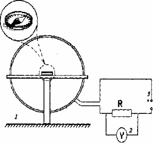 Рисунок 3 Схема лабораторной установки 1-тангенс-гальванометр, 2-мультиметр, 3-истчник питания 2. Соберите электрическую цепь, представленную на рисунке 3. Мультиметр включите в режим измерения постоянного напряжения до 20V. 3. Вращая катушку тангенс-гальванометра вокруг вертикальной оси, совместите северный полюс магнитной стрелки с нулевым делением шкалы компаса. 4. Включите источник питания, установите минимальный уровень выходного напряжения и плавно увеличивайте его до тех пор, пока стрелка компаса не начнет отклоняться. Если стрелка отклонилась в область углов 270° - 360°, измените полярность подключения источника питания. После успокоения колебаний магнитной стрелки, запишите в таблицу значение угла ее отклонения. (Цена деления шкалы - 5°.) 5. Запишите в таблицу показания мультиметра и продолжите эксперимент, последовательно увеличивая выходное напряжение источника питания и внося показания мультиметра в таблицу. При проведении измерений сила тока в цепи не должна превышать 0,5 А, что соответствует напряжению 6В, измеряемому мультиметром. После достижения этого значения повторите измерения при постепенном уменьшении напряжения источника питания. 6. Для обработки данных воспользуйтесь таблицей 3. Первый столбец таблицы содержит значения падения напряжения на резисторе R. Во втором столбце таблицы записаны значения углов отклонения магнитной стрелки. Сила протекающего через катушку тангенс-гальвонометра тока (I) рассчитывается в третьем столбце на основе закона Ома. В четвертый столбец таблицы вписываются вычисленные значения индукции магнитного поля, создаваемого катушкой тангенс-гальвонометра в месте расположения магнитной стрелки. При этом используется формула (1). Пятый столбец таблицы предназначен для вычисления тангенса угла отклонения магнитной стрелки. 7. Для определения величины горизонтальной составляющей индукции магнитного поля Земли необходимо построить график зависимости тангенса угла отклонения магнитной стрелки от индукции магнитного поля катушки. Для построения зависимости отложите по оси ординат значения тангенса угла отклонения магнитной стрелки, а по оси абсцисс - соответствующие им величины индукции магнитного поля катушки. Вы увидите, что полученная зависимость близка к линейной. 8. Горизонтальная составляющая магнитного поля Земли ВГ вычисляется как величина, обратная угловому коэффициенту k прямой, построенной по экспериментальным данным на графике: Bг=1/k. Таблица 3