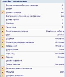 Во всех приложениях Microsoft Office в нижней части окна отображается строка состояния, в которой выводится различная информация (Рис.1.1). В Microsoft Office 2007 срока состояния претерпела некоторые изменения. Теперь надписи, отображающие различную информацию, являются также и кнопками, с помощью которых можно вызвать различные диалоговые окна. В правой части строки состояния теперь находятся кнопки для переключения различных режимов просмотра документа, а также ползунок для изменения масштаба документа. Вы можете сами настроить параметры строки состояния. Для этого нужно щелкнуть правой кнопкой мыши в строке состояния и в появившемся контекстном меню (Рис.1.5) включить или выключить режим вывода в строке состояния нужных элементов управления.