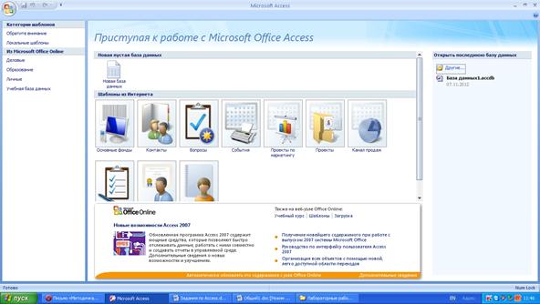 Рис.1 Открытие существующей базы данных Создание новой пустой базы данных Для создания новой пустой базы данных необходимо: 1. На появившейся странице Приступая к работе с Microsoft Office Access щелкнуть на значке Новая база данных - 2. В поле Имя файла раздела Новая база данных ввести имя базы. 3. Выбрать для размещения новой базы данных нужную папку и щелкнуть на кнопке Создать (рис. 2).