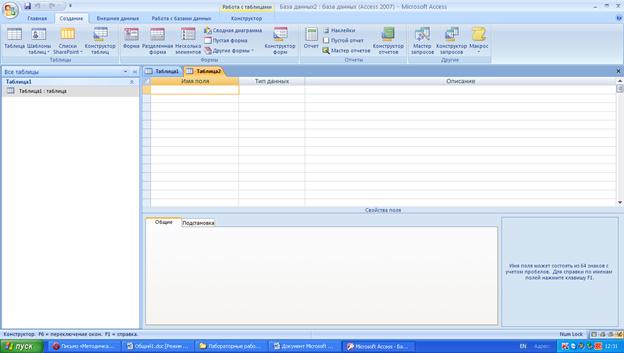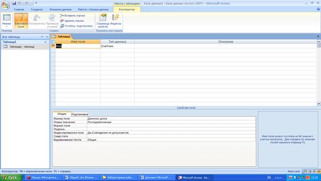 Создание таблицы с помощью Конструктора таблиц Теперь мы познакомимся с режимом Конструктора. В режиме Конструктора таблицы создаются путем задания имен полей, их типов и свойств. Чтобы создать таблицу в режиме Конструктора, необходимо: 1. Перейти на вкладку Создание и щелкнуть по кнопке Конструктор таблиц. Откроется окно Конструктора таблиц (рис.4). 2. В окне Конструктора таблиц в столбец Имя поля (Field Name) ввести имена полей создаваемой таблицы. 3. В столбце Тип данных (Data Type) для каждого поля таблицы выбрать из раскрывающегося списка тип данных, которые будут содержаться в этом поле. 4. В столбце Описание (Description) можно ввести описание данного поля (не обязательно). 5. В нижней части окна Конструктора таблиц на вкладках Общие (General) и Подстановка (Lookup) ввести свойства каждого поля или оставить значения свойств, установленные по умолчанию. 6. После описания всех полей будущей таблицы нажать кнопку Закрыть (в верхнем правом углу окна таблицы). 7. На вопрос Сохранить изменения макета или структуры таблицы Имя таблицы? нажать кнопку Да (Yes).
