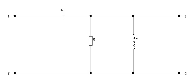 Передаточное сопротивление и передаточная проводимость имеют соответственно размерность сопротивления и проводимости и также являются в общем случае комплексными величинами, зависящими от частоты. Зависимости модулей комплексных отношений представляют собой амплитудно – частотные, зависимости их аргументов – фазо – частотные характеристики четырехполюсника. Эти характеристики имеют важное значение для работы устройств автоматики и радиотехники. В данной курсовой работе приведен расчет только коэффициента передачи по напряжению. На рисунке 1.8 приведена электрическая схема рассчитываемого четырехполюсника.