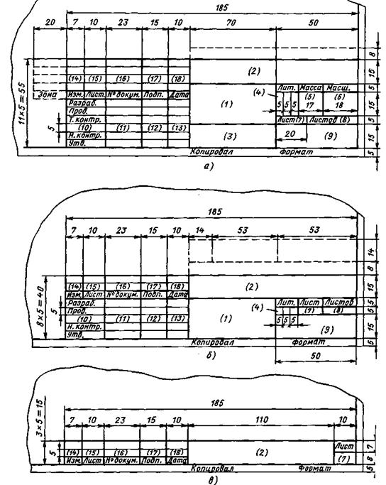 где а) – для чертежей и схем; б) – для текстовых документов; в) – для последующих листов чертежей, схем, и текстовых документов.