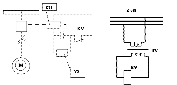Схеманың жұмысы: Кернеудің төмендеуі кезінде сөндіретін қорғанысты жоғары кернеулікті (6-10 кВ) асинхронды және синхронды двигательдер үшін қолданады. 3-суретте минималдық қорғаныстың принципиалдық схемасы бейнеленген. Кернеу жоғалып кеткенде немесе ол (0,6-0,7)Uн авариялық деңгейге дейін төмендегенде KV кернеу релесі сөніп, өзінің кондансатор тізбегіндегі түйіспесін жабады. Осы кезде С конденсаторы КО сөндіру электромагниті (катушкасы) арқылы разрядталады. Разрядталу тоғы жүргенде КО электромагниті майлы ажыратқышты сөндіріп М двигателін тоқтатады. С- конденсаторын үнемі зарядтап отыру үшін «УЗ» - зарядтау қондырғысы қолданылған.