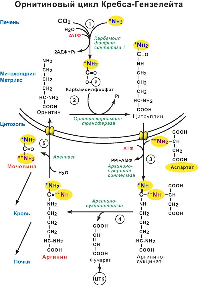 ~ 90% N удаляется из организма с мочой почками в составе мочевины. Синтез мочевины происходит в печени в процессе, который называется орнитиновый цикл (цикл Кребса – Гензелейта). Орнитиновый цикл – это циклический процесс. Ключевое соединение, замыкающее цикл – α-аминокислота орнитин.