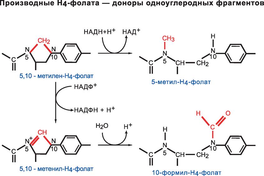 ! Все производные H4-фолата – это доноры одноуглеродных фрагментов в синтезе многих соединений. Например: синтез пуриновых и пиримидиновых нуклеотидов; регенерация метионина; синтез ряда биогенных аминов и др. Синтез H4-фолата происходит в печени: