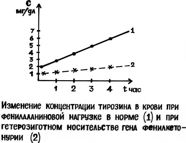 Без лечения больные фенилкетонурией не доживают до 30 лет. Заболевание наследуется по аутосомно-рецессивному типу. Выделяют 2 формы фенилкетонурии: 1) Классическая фенилкетонурия: Причина: наследственный дефект фермента фенилаланингидроксилазы. Частота заболевания: 1 случай на ~ 10000 новорожденных. 2) Вариантная фенилкетонурия: (коферментзависимая гиперфенилаланинемия) Причина: мутации в генах, контролирующих метаболизм H4-биоптерина. Встречается: 1-2 случая на ~ 1 млн. новорожденных. H4-биоптерин необходим для гидроксилирования не только Фен, но и Тир и Три, поэтому, при этой форме заболевания нарушен метаболизм всех 3 аминокислот, а также синтез многих нейромедиаторов. При этой форме заболевания возникают тяжелые неврологические нарушения и ранняя смерть. Лечение фенилкетонурии: диета, с почти полным исключением из пищи фенилаланина. ! Начинать: сразу после рождения ребенка. Для диагностики фенилкетонурии определяют концентрацию фенилаланина и патологических метаболитов в крови и моче больного. В генетической консультации, для выявления гетерозиготного носителя заболевания, используют тест толерантности к фенилаланину: