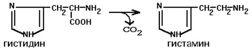 Гистамин является медиатором и содержится в нервных клетках и в тучных клетках. Обладают сильным сосудорасширяющим действием. Гистамин хранится в секреторных гранулах и секретируется в кровь при повреждении ткани (удар, ожог и т.д.). Особенно много его выделяется в очаге воспаления. Гистамин играет важную роль в проявлении аллергических реакций. Известно 2 типа рецепторов к гистамину:H1 и H2. Эффекты гистамина: - расширение капилляров и повышение сосудистой проницаемости; - понижение артериального давления; - повышение тонуса (спазм) гладких мышц - в том числе гладкой мускулатуры бронхов; - усиление секреции желудочного сока; Некоторые из этих эффектов позволяют гистамину принимать участие в формировании аллергических проявлений. Антигистаминные препараты применяются с целью предотвратить образование гистамина и обладают противовоспалительным и антиаллергическим действием. По механизму действия некоторые из них являются ингибиторами гистидиндекарбоксилазы, а другие конкурируют с гистамином за взаимодействие с рецепторами клеток. Блокаторы Н1-рецепторов используются в основном как противоаллергические средства - димедрол, супрастин и т.д. 4. Сериндекарбоксилаза. Катализирует первую реакцию синтеза ацетилхолина из серина. Ацетилхолин – возбуждающий медиатор вегетативной нервной системы. 5. Декарбоксилаза ароматических аминокислот Имеет широкую субстратную специфичность. Превращает несколько разных аминокислот: а) триптофан - в триптамин б) 5-окситриптофан - в триптамин (серотонин) в) 3,4-диоксифенилаланин - в дофамин