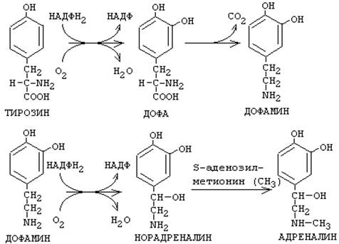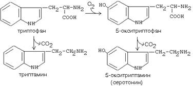 Серотонин вырабатывается в нервной ткани. Некоторые виды головных болей (мигрени) связаны с избыточной выработкой серотонина. Серотонин сужает сосуды, регулирует свертывание крови. Обладает антиаллергическим действием. Триптамин обладает сходным эффектом. Аминокислота фенилаланин может в результате окисления присоединять две ОН-группы в кольце и превращаться в диоксифенилаланин (ДОФА). Из него под действием декарбоксилазы ароматических аминокислот образуется дофамин. Дофамин является предшественником катехоламинов - норадреналина и адреналина.