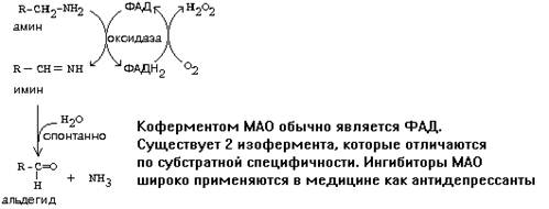Оксидазы биогенных аминов: моноаминооксидаза (МАО), диаминооксидаза (ДАО), полиаминооксидаза. Оксидазы отнимают два протона и два электрона и передают их сразу на кислород. Образуется перекись водорода, а амин превращается в ИМИН. Этот имин легко гидролизуется без участия фермента и превращается в альдегид. Простетической группой ферментов оксидаз является ФАД или ФМН, т.е. они являются флавопротеинами. Вторая реакция (гидролиз) необратима. Образовавшийся в итоге альдегид легко окисляется до карбоновой кислоты, которая распадается до СО2 и H2O. МАО в клетке больше, чем ДАО. Угнетение МАО приволит к замедлению распада биогенных аминов. Такие лекарства продлевают период существования биогенных аминов, что особенно важно при их недостатке. Эти вещества играют роль антидепрессантов и используются, в частности, при лечении шизофрении. Аминокислоты декарбоксилируются в цитоплазме, а окисление аминов происходит в наружной мембране митохондрий. Поскольку реакция декарбоксилирования аминокислот и разрушение биогенных аминов происходят не одновременно, то биогенные амины могут некоторое время существовать и выполнять свою биологическую функцию. ДЕЗАМИНИРОВАНИЕ АМИНОКИСЛОТ У человека происходит в основном путем окислительного дезаминирования. Эти реакции протекают с помощью двух ферментов: - оксидаза Д-аминокислот - оксидаза L-аминокислот
