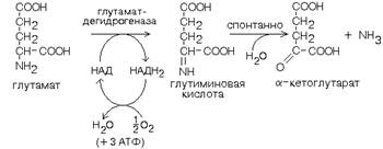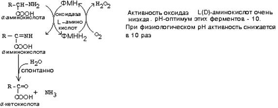 Эти ферменты обладают групповой стереоспецифичностью. Оксидазы отнимают протоны и электроны от аминокислот с помощью такого же механизма, как и оксидазы, обеспечивающие дезаминирование биогенных аминов. Эти ферменты являются флавопротеинами и содержат в качестве простетической группы ФАД или ФМН: На первой стадии образуется иминокислота, а затем, после спонтанного гидролиза образуется альфа-кетокислота. Кроме оксидаз имеется еще один фермент, катализирующий окислительное дезаминирование глутаминовой кислоты - глутамат-дегидрогеназа (глутаматДГ). Этот фермент является НАД-зависимым и обладает высокой активностью (как и другие НАД-зависимые дегидрогеназы). В этом его отличие от оксидаз аминокислот, которые медленно превращают аминокислоты в физиологических условиях (поэтому в клетке сохраняется большинство аминокислот). Так как глутамат-ДГ является никотинамидной, то отнимаемые протоны и электроны не передаются сразу на кислород, а транспортируются по полной цепи МтО с образованием воды и параллельным образованием трех молекул АТФ.