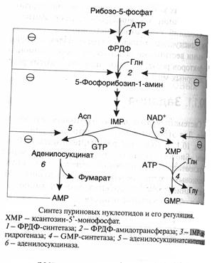 Последовательность реакций, которая ведет к образованию пуриновых нуклеотидов, начинается с синтеза 5-фосфорибозил-1-дифосфата — ФРДФ (он же пирофосфат — ФРПФ), являющегося общим предшественником фосфорибозы в синтезе пуриновых и пиримидиновых нуклеотидов (рис.8). Перенос амидной группы глицина на ФРДФ с образованием 5-фосфорибозил-1-амина катализирует регуляторный фермент синтеза пуриновых нуклеотидов ФРДФ-амидотрансфераза. В синтезе пуриновых нуклеотидов не образуется свободное азотистое основание, а пуриновое кольцо формируется на остатке рибозо-5-фосфата при участии молекулы глицина, амидного азота глутамина, a-NH2-группы аспарагина, СО2 и одноуглеродных производных: метенил- и формил-Н4-фолата. Синтезируется первый пуриновый нуклеотид — инозиновая кислота (IMP), которая двумя последовательными реакциями может превращаться в AMФ или в ГМФ.