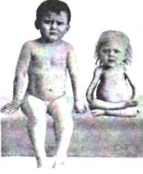 Ш\ it Рис. 75. Тяжелый рахит у ребенка 2 лет, рядом здоровый ребенок того же возраста (по R. Berg, 1927) в почках пептидными факторами, синтезированными в опухолевых тканях. Физиологически активной формой является не сам витамин D, а его метаболиты (в настоящее время их известно более 40 - 25-OHD, la,25-(OH)2D3, 24,25-(OH)2D,, 25,26-(OH)2D,, l,24,25-(OH)3D3 и др.), образующиеся в результате обменных превращений в тканях. Образование кальцитриола (1,25-дигидроксихолекаль-циферол [l,25-(OH)2D3]), поддерживающего уровень кальция и фосфора в сыворотке крови в узких физиологических границах, происходит в организме в несколько этапов. Фотохимически синтезированный в коже витамин D3 под воздействием гидроксилаз подвергается двум реакциям гидроксилирования: сначала в печени в 25-м положении (25-гидроксилаза), затем в почках в 1-м положении (1а-гидроксилаза) (схема 18). Образование активной формы витамина D3 в почках контролируется через систему обратных связей с обменом Са, Р, секрецией парати-реоидного гормона, кальцитонина, соматостати-на, пролактина, половых гормонов и инсулина. Избыток l,25-(OH)2D3 в организме ингибирует его образование. Дефицит витамина D ведет к понижению концентрации кальция и фосфора в сыворотке крови и нарушениям деятельности многих систем организма: нервной, мышечной, костной, репродуктивной, иммунной. Регулирующий эффект витамина D в отношении кальций-фосфорного