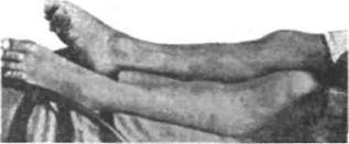 Рис. 74. Поздний рахит (по R. Berg, 1927) липидов, в том числе жирорастворимых витаминов (механическая желтуха, холестаз, панкреатическая недостаточность); нарушении образования активных форм витамина: гидроксили-рования в печени (при циррозе) и в почках (при хронической почечной недостаточности); усилении распада (например, под влиянием ряда лекарственных препаратов, индуцирующих активность ферментов системы микросомального окисления при участии цитохрома Р450). Уменьшение синтеза и/или поступления витамина D с пищей, нарушения метаболизма холекальциферола вызывают «кальципеничес-кий» рахит у детей и остеомаляцию у взрослых. Нарушения фосфорно-кальциевого обмена, играющие главную роль в патогенезе рахита, приводят к нарушению минерализации костной ткани, особенно в зонах роста трубчатых и черепных костей. Помимо нарушения минерализации остеоида, при рахите наблюдаются усиленное рассасывание костной ткани, вымывание кальция и фосфата из кости, потеря фосфата с мочой, что обусловлено гиперсекрецией парат-гормона (развитие вторичного гиперпаратирео-за), стимулируемой низким уровнем кальция в крови. Ухудшение энергообеспечения процессов костеобразования и минерализации костной ткани связано с нарушением всасывания и метаболизма цитрата при недостатке витамина D. Рахитические кости медленнее растут, не способны выдерживать нормальную статическую и динамическую нагрузки, легко подвергаются механическим деформациям, что обусловливает внешние проявления рахита со стороны скелета: искривление нижних конечностей, рук и позвоночника, утолщение эпифизов длинных трубчатых костей («рахитические браслеты»), «рахитические четки» на грудных концах ребер, «куриная грудь» с выступающей грудиной и сдавленными с боков ребрами, задержка закрытия родничков и прорезывания зубов, «лоб Сократа» (периостальные наслоения остеоида в области лобных и теменных бугров), краниота-бес (уплощение затылочных костей) (рис. 74,75). К ранним клиническим проявлениям рахита относятся раздражительность, мышечная гипотония (связанная не только с изменением нервной регуляции, но и с нарушением структуры и метаболизма мышечных волокон), тетания (в связи с системной гипокальциемией), облысение затылка, развитие бронхолегочных заболеваний,
