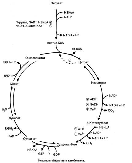 Рис. 9. Регуляция пируватдегидрогеназного комплекса В составе ПДК содержатся 2 регуляторные субъединицы: киназа и фосфатаза. Киназа фосфорилирует ПДК и переводит его в неактивную форму, фосфатаза отщепляет фосфорный остаток от ПДК и переводит его в активную форму. Киназа ПДК аллостерически активируется АТФ, НАДН и ацетил-КоА, а ингибируется пируватом, АДФ, НАД, HSKoA, Са2+ (рис.10). Киназа ПДК аллостерически активируется НАДН, ацетил-КоА и АТФ, следовательно, при их накоплении прекращается дальнейшее превращение пирувата в ацетил-КоА. Такая ситуация создается, например, в печени при голодании: из жировых депо в печень поступают жирные кислоты, в митохондриях в результате специфического пути их катаболизма накапливается большое количество ацетил-КоА и НАДН. Пируват при этом не окисляется и может быть использован для синтеза глюкозы (глюконеогенеза). Киназа ПДК аллостерически иигибируется пируватом, AДФ, HSKoA, Са2+. В абсорбционный период глюкоза поступает в клетки и распадается с образованием пирувата. Высокая концентрация пирувата действует на ПДК двумя способами: • поддерживает ПДК в нефосфорилированной активной форме, так как это наиболее сильный ингибитор киназы ПДК; • аллостерически активирует нефосфорилированную активную форму ПДК, действуя согласованно с другими активаторами - субстратами реакций - НАД+ и HSKoA. В результате создаются условия для образования ацетил-КоА из глюкозы. Ацетил-КоА может окисляться в ЦТК; в печени и жировой ткани часть ацетил-КоА используется для синтеза жирных кислот. Регуляция ионами Ca2+ особенно важна в мышцах. Потенциал действия увеличивает концентрацию Ca2+ в митохондриях, что одновременно ингибирует киназу и активирует фосфатазу; это быстро переводит ПДК в активную нефосфорилированную форму. Одновременно Са2+ активирует регуляторные ферменты ЦТК, и ацетил-КоА быстро окисляется, обеспечивая синтез АТР для работы мышц.