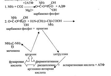 Еще в прошлом веке русские ученые М.В. Ненцкий и С.С. Салазкин показали, что в печени происходит образование мочевины из углекислого газа и аммиака. Кребс и Гензеляйт установили, что синтез мочевины представляет собой циклический процесс, в котором ключевым соединением, замыкающим цикл, является орнитин. Кохен и Ратнер выяснили, что начальной реакцией этого цикла является синтез карбамоилфосфата.