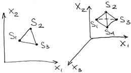 Рисунок 3.14 – Примеры симплекса на плоскости и в пространстве В алгоритме симплексного используется важное свойство симплексов: против любой из вершин симплекса Sj расположена только одна грань, на которой можно построить новый симплекс путём переноса выбранной вершины на надлежащее расстояние вдоль прямой, проведённой через центр тяжести остальных вершин начального симплекса. Полученная таким образом точка является вершиной нового симплекса, а выбранная при построении вершина начального симплекса исключается (рис. 3.14).