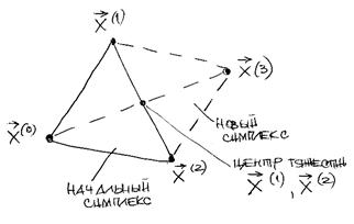 Рисунок 3.15 – Построение нового симплекса на плоскости Основная идея симплексного метода заключается в том, что по известным значениям Рассмотрим алгоритм этого метода на примере отыскания минимума