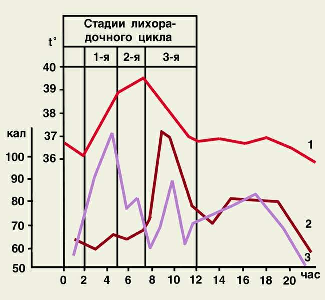 Рис. 1. Изменение температуры тела (1), общей теплоотдачи (2) и теплопродукции (3) в зависимости от стадии лихорадки во время приступа малярии. ТЕМПЕРАТУРНЫЕ КРИВЫЕ ПРИ РАЗЛИЧНЫХ ТИПАХ ЛИХОРАДКИ — ПОСТОЯННАЯ