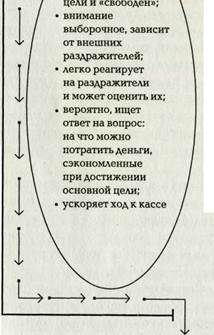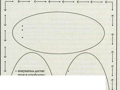 Рис. 3.8. Наиболее вероятное поведение покупателя на отдельных этапах маршрута его движения по торговому залу В отличие от предыдущей зоны (зоны покупки), где покупатель делает запланированные покупки, в зоне возвращения он готов купить то, что ему «предлагают» и «навязывают» посредством ориентированных на него раздражителей. Мерчандайзинговый подход к последовательности размещения отделов (секций) имеет еще одно преимущество: он исключает раздражение покупателя в начале пути и формирует благосклонное отношение к деятельности предприятия. Раздражители в конце маршрута не так возмутительны для покупателя и не способны существенно влиять на его настроение, поскольку они появляются после выполнения им своей «миссии», когда он ищет, чем еще занять свое внимание, теперь уже свободное от всякого напряжения.