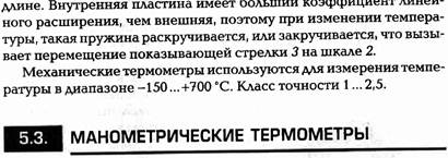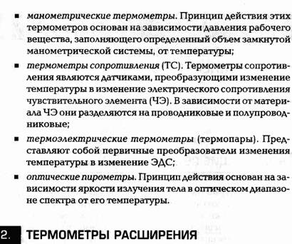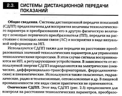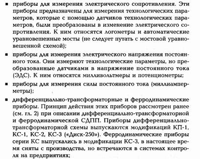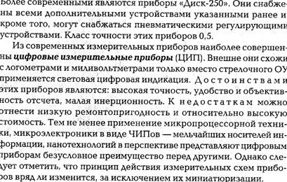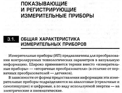 1-4. Контроль измерительных приборов Для обеспечения единообразия, верности и правильного применения мер и измерительных приборов установлен определенный порядок их контроля. Для этой цели организована Государственная служба мер и измерительных приборов во главе с Государственным комитетом СССР по стандартам. Контроль- ные операции осуществляются при помощи образцовых и эталонных мер и приборов. Основными операциями контроля приборов являются испытание, градуировка и поверка. При испытании вновь разработанные и предназначенные для производства меры и приборы проходят всестороннюю проверку для установления целесообразности их производства. Градуировкой называется операция, при помощи которой делениям шкалы прибора придают значения, выраженные в единицах измерения. Эта операция осуществляется приборами более высокой точности. По нескольким точкам значений измеряемой величины строят градуировочные кривые, на основании которых на шкалу наносят значения, соответствующие определенным отметкам шкалы. Градуировка производится при изготовлении приборов или при изменении условий их применения. Поверкой называется сравнение показаний поверяемых приборов с показаниями образцовых для определения их погрешности. При поверке, кроме определения погрешностей, проводят внешний осмотр и опробование приборов, определяют сопротивление электрической изоляции, качество записи показаний, скорость передвижения диаграммной ленты. Все рабочие приборы поверяют в лаборатории не реже одного раза в два года.-Кроме того, приборы поверяются на месте установки: наиболее ответственные– один раз в смену или сутки, все другие – от одного раза в неделю до одного раза в три месяца. Поверка на месте часто сводится к определению погрешности показаний прибора на рабочей точке шкалы и правильности возврата стрелки к нулевой точке. 1.5. Государственная система промышленных приборов и средств автоматизации (ГСП) Большая разнотипность измерительных приборов и средств автоматизации затрудняет их эксплуатацию и ремонт. В целях рационального использования средств измерения проводятся работы по объединению отдельных систем приборов в рамках Государственной системы приборов (ГСП). ГСП представляет собой совокупность приборов и средств автоматизации, предназначенных для получения, обработки и использования информации. ГСП включает ряд унифицированных блоков и устройств, имеющих единые параметры входных и выходных сигналов, нормализованные габаритные и присоединительные размеры. Переход к разработке систем приборов, объединенных одним принципом действия, позволяет получать большое число разнообразных измерительных устройств из небольшого количества типовых блоков. Кроме того, значительно повышаются на- дежность и стабильность измерительных приборов, упрощается их эксплуатация. По роду вспомогательной энергии сигналов, а также виду сигналов приборы и средства автоматизации делятся на 5 групп, которые называются ветвями: электрическую аналоговую, электрическую дискретную, пневматическую, гидравлическую, приборов и устройств без источников вспомогательной энергии. Электрическая аналоговая ветвь является системой, в которой энергетическим сигналом информации служит непрерывный электрический сигнал. Система состоит из устрой
