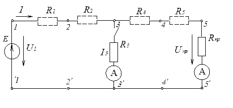 1.2.Для этого вывести на экран: Один источник постоянной ЭДС и сопротивления согласно варианту из набора элементов; 3 амперметра, 4 вольтметров из «окошка». 1.3. Установить напряжение источника питания; значения сопротивлений согласно варианту (таблица 3). Для этого дважды нажав на ЭДС, а затем на сопротивление, изменить значения напряжения источника питания и сопротивления и установить размерность – Ом (Ω). 1.4.Выполнить необходимые соединения. 2. К линии передачи подключить переменную нагрузку регулируя сопротивление нагрузки в пределах от ∞(нагрузка в средней части линии отключена, что соответствует первой строчке опытных данных) до 0 (нагрузка в средней линии закорочена, что соответствует последней строчке опытных данных). Далее к линии передачи подключить переменную нагрузку 2. Измерить распределение напряжения вдоль линии в одном из режимов ее работы. З.Не меняя сопротивление нагрузки (пункт 2), включить приемник в средней части линии и измерить распределение напряжения вдоль линии. 4.По данным пункта 1 рассчитать и построить зависимости в функции тока: а) мощность источника б) мощность приемника в) потери мощности в линии г) КПД линии 5.По данным пунктов 2 и 3 построить графики распределения напряжения вдоль линии 6.Сделать выводы, объяснить характер полученных кривых.