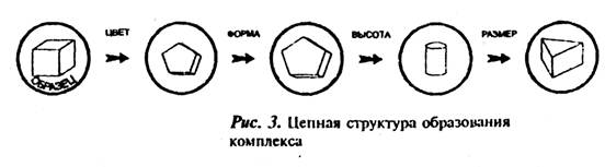 Вторая структура комплекса - цепная (рис. 3). В данном случае эталон дает начало последовательности, в которой каждый новый объект подбирается к предыдущему по разным объективным признакам. Например, к эталону объект подобран по цвету, следующий сходен с этим объектом по форме и т.д.