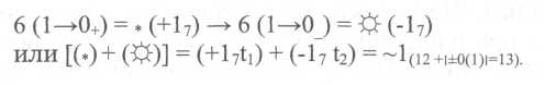 В данной символике представлено взаимодействие шести векторов пространства, которые в первом цикле «сжимаются», «ищут» место в пространстве, где они могут уравновесить свои потенциалы таким образом, что точка их первичного контакта (встречи в пространстве) перестала перемещаться в пространстве под воздействием сил того или иного вектора. В какой-то миг времени после сложной траектории «точки встречи» их противодействие «исчезнет», станет нулевым, пространство напряженности как бы «сломается», превратиться в частичку «пустоты» минимально возможного во Вселенной размера. Все шесть векторов отквантуются в равновеликие пространственные радиусы, что позволяет сказать, что пространство отквантовалось в «заряженную» частичку, плотность которой достигает максимального уровня возможного для Вселенной. Вектора образуют организационную единицу пространства, фокусирующуюся в единой точке, которую можно считать их седьмой компонентой (пространственной координатой размещения). Во втором цикле взаимодействия с пространством организационная единица (сим-точка) меняет знак своего потенциала (свойство) на противоположный. Под воздействием окружающих точек ее «нейтралитет» нарушается, какой-то из векторов начинает расширяться и энергия, сжатая в этой точке, покидает ее, возникает волновой импульс, в данной точке пространства «рождается» новое качество (качество расширения). Часть сим-точки работает как масса, служит базой для отражения энергетической волны, часть превращается в энергию, поток более мелких составляющих и этот процесс идет по всей Вселенной в громадном количестве сиеметрин, её составляющих. Свойство организационных единиц пространства (сим-точек) к трансформации отражает вторая строчка формулы, интерпретирующая первую. Эти точки пульсируют - сжимаются и расширяются. Первый временной период характеризует момент «упаковки потенциала», «накачки» заряда в точку, второй временной период характеризует момент разрядки точки. Фактически потенциал сим-точки как место размещения шести векторов, сжатых до размеров точки, имеет возможность проявляться в пространстве своими линейными характеристиками по тринадцати направлениям. Шесть векторов работают на сжатие, шесть на расширение, а при порционной упаковке, квантовании потенциалов в сим-точке, цикличном функционировании ее как организационной единицы, проявляется ее двойственная характеристика (в определенный момент времени она меняет свои свойства на противоположные, поэтому при характеристики ее цикличности можно использовать число тринадцать, а не четырнадцать (двойственное качество (сжатие-расширение) - свойство организационных единиц (сим-точек), имеющих место расположения как единицу пространства (пространственный квант). Организационная «семерка сжатия» и организационная «семерка расширения» при своем рассмотрении как пространственной точки показывают, что организационная, седьмая единица это одно и то же место пространства (сим-точка) и сложение двух функционирующих «семерок» дает число не четырнадцать, как это представляется при анализе, а тринадцать, если применить синтез. Сиеметрино, как точка пространства, характеризующая место симметрии деления трех прямых, пересекающихся в этой точке, определяющих направление векторов взаимодейс