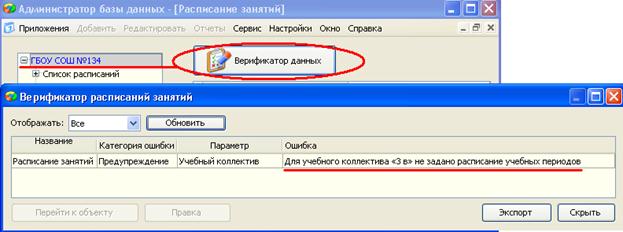 Для того чтобы проверить корректность заполнения учебных периодов и привязки учебных коллективов к учебным периодам удобнее всего воспользоваться верификатором данных, встроенным в приложение «Расписание занятий»:
