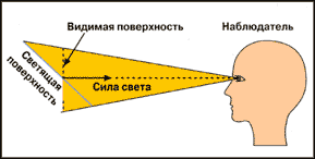 Кроме общего количества света, излучаемого источником в пространство, необходимо представлять распределение излучения по направлениям. Например, даже самая обыкновенная лампа накаливания покажется темной, если смотреть на нее со стороны цоколя, и ослепительно яркой во всех остальных направлениях. Интенсивность излучения традиционно оценивается его потоком, распространяющимся в данном направлении. Говоря математически, интенсивность равна потоку в исчезающем малом телесном угле, отнесенному к этому углу. Для светового излучения она описывается силой света, единицей измерения которой является 1 кандела (кд). Как следует из определения, сила света одного и того же источника может быть разной в зависимости от выбранного нами направления. I=F/телесный угол