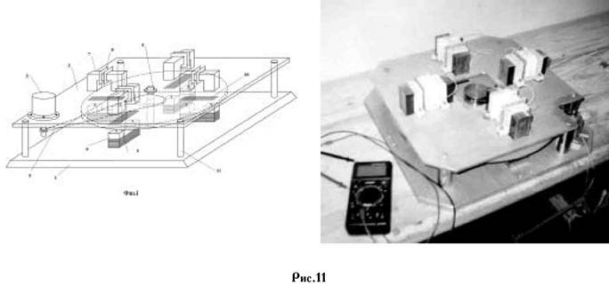 В 1992 году Годин и Рощин, Россия, успешно экспериментировали с установкой данного типа и получили мощность порядка 7 Киловатт [9], Рис.7. Отметим, что при работе системы в экспериментах Година и Рощина отмечалось значительное уменьшение веса установки, а поскольку силу порядка 100 кг нельзя считать ошибкой измерения или аэродинамическим эффектом, то рассматриваемая здесь концепция преобразования форм энергии получает еще одно подтверждение. Антигравитационные эффекты, возникающие при работе сверхединичных устройств (систем, эффективность которых более единицы), отмечались различными изобретателями, независимо от конструкции системы. В 1990 году американец Флойд Свит демонстрировал свое изобретение, названное «вакуумным триодным усилителем». Подготовленные специальным образом бариевые магниты, использовались в «триггерном режиме». Бистабильное состояние вещества магнита обеспечивало возможность перехода от одного направления поля к другому при подаче на управляющую обмотку слабого сигнала от внешнего генератора. Причем, если материал подготавливался путем многократного перемагничивания на частоте 60 Герц, то его управляющий сигнал должен иметь ту же частоту. Принцип управления мощным потоком за счет слабого сигнала используется в триодах, поэтому устройство получило название вакуумный триодный усилитель ВТУ (Vacuum Triode Amplifier — VTA). Часть выходной мощности устройства Флойда была замкнута в петлю обратной связи для возбуждения процесса, в результате которого в выходной катушке появляется значительная мощность. Том Берден, член Ассоциации выдающихся американских ученых ADAS, изучив схему вакуумного триодного усилителя, утверждал, что оно демонстрирует работу с отрицательной энергией, в том смысле, что работа связана с использованием отрицательного времени. В этом отрицательном времени, по Вердену, гравитация является отталкивающей силой. Эксперименты Флойда Свита показали, что система теряла вес пропорционально извлекаемой мощности. Флойд пытался документировать пределы изменения веса, но однажды он достиг такой степени изменения, при которой он услышал сильный резкий звук, как будто он находился в центре гигантского воздушного вихря, после чего эксперимент был прекращен.