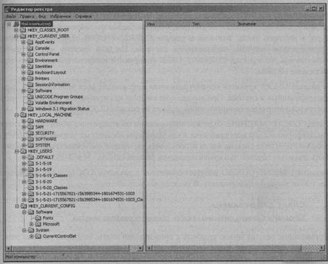 Назви основних ключів починаються з позначення HKEY. Є п'ять основних ключів: - HKEY_CLASSES_ROOT; - HKEY_CURRENT_USER; - HKEY_LOCAL_MACHINE; - HKEY_USERS; - HKEY_CURRENT_CONFIG. Вміст основних ключів повинен бути зрозумілою з їх описових назв. Розділ CLASSES ROOT розбиває файли системи на дві групи по типу розширення імені файлу і по асоціації. Цей розділ також містить дані про значки, асоційованих з файлами. Розділ CURRENT_USER містить дані про специфічних для поточного користувача конфігураційні параметри системи, включаючи параметри колірній схеми, клавіатури і робочого столу. Значення в розділі CURRENT_USER відображають настройки, встановлені поточним користувачем системи. Коли в систему входить інший користувач, то в розділ CURRENT_USER копіюються відповідні параметри з розділу USERS. В розділі USERS зберігається конфігураційна інформація всіх користувачів, зареєстрованих в системі. При виході користувача з системи або при виключення системи в цей розділ копіюється інформація з розділу CURRENT_USER. Розділ LOCAL_MACHINE містить інформацію про апаратне забезпечення системи. Інформація про всі драйвери і конфігурацію апаратних пристроїв зберігається в цьому ключі. Щоб система могла використовувати периферійний пристрій, воно повинне бути належним чином задокументовано в розділі LOCAL_MACHINE. Розділ CURRENT_CONFIG працює спільно з розділом LOCAL_MACHINE, надаючи поточну інформацію про апаратні пристрої. Організацію реєстру можна порівняти з організацією книги: основні розділи реєстру відповідають частинам, розділи і підрозділи — главам і підзаголовкам в розділах, і параметри реєстру подібні пропозиціям, що передають інформацію словами — даними. Параметри можуть містити широкий діапазон видів інформації. Наприклад, параметр може містити номер переривання і адресу порту периферійного пристрою або просто інформацію про встановлену прикладну програму. Ця інформація може представлятись як двійкові або рядкові дані або дані типу dword. Дані параметра відображаються в правій панелі вікна Редактора реєстру. В Windows ХР вміст реєстру зберігається в п'яти файлах, які називаються кущами (hive). Кущі представляють основні частини всіх розділів, підрозділів, параметрів і значень реєстру. Далі приводиться список кущів реєстру Windows ХР: - SAM; - SECURITY; - SOFTWARE; - SYSTEM; - DEFAULT. Ці файли, їх резервні копії і файл журналу для кожного куща зберігаються в каталозі Windows\System32\Config. Конфігураційна інформація для кожного, хто увійшов до системи користувача міститься в каталозі \Windows\Profiles в індивідуальній теці для кожного користувача. Частина реєстру з інформацією про призначені для користувача настройки зберігається у файлі NTUSER.DAT, який знаходиться в теці \Documents_and_Settings\userxxx. Різні частини реєстру з системною інформацією розподілені по кущах SOFTWARE, SYSTEM, SECURITY і SAM, які зберігаються в теці \Windows\System32\Config. В табл. 13.1 показані назви основних кущів реєстру Windows і їх відповідні файли.