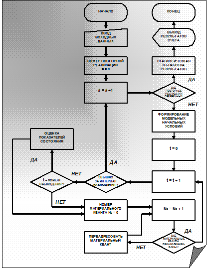 Блок формирования модельных начальных условий обеспечивает преобразование заданных начальных условий в модельное представление – своего рода трансляцию. Существенной особенностью создаваемой на основе метода переходов имитационной модели является то, что для нее существенно облегчена процедура формирования модельных начальных условий, т.к. и внешние и модельные начальные условия организованы по схеме «от события», «от момента времени». Блок реализации повторных имитационных экспериментов обеспечивает переборочную процедуру по повторным реализациям. С условием оговоренной особенности начальных условий нецелесообразно формировать неприкосновенную копию модельных начальных условий с последующим их тиражированием для каждой повторной реализации, и этот блок можно встраивать в блок реализации повторных имитационных экспериментов. Блок обработки результатов повторных реализаций имитационного эксперимента подразумевает статистическую обработку значений оценок показателей состояния, оцененных для каждой повторной реализации для каждого дискретного момента их наблюдений. Блок-имитатор объекта моделирования выполняет функции изменения состояния материальных квантов в дискретные моменты модельного времени. В блоке-имитаторе объекта моделирования, в свою очередь, выделяются локальные блоки-имитаторы, задействованные для каждого очередного анализируемого материального кванта в зависимости от его нахождения в том или ином выделенном субподобъекте-доноре. Общая схема функционирования имитационной модели на базе метода модельных переходов отражена на блок-схеме, представленной на рис. 2.5. В содержательном плане функционирование осуществляется следующим образом. Первоначально производится ввод исходных данных. Далее организуется фиксированное число повторных итераций по повторным реализациям имитационного эксперимента. Для каждой из этих итераций сначала производится формирование начальных модельных условий. Затем организуется проведение каждой из предусмотренных повторных реализаций (их число задается априорно, исходя из требований по статистическим характеристикам подлежащих оцениванию показателей состояния). С учетом низкого уровня стохастичности в модели число повторных реализаций имитационного эксперимента может быть ограничено десятью. Для каждой из фиксированных повторных реализаций имитационного эксперимента организуются: - оценка значений показателей состояния для фиксированной реализации и моментов времени, заданных как моменты оценки значений показателей состояния; - переадресация материальных квантов из субподобъекта в субподобъект для каждого из выделенных дискретных моментов времени. После завершения всех предусмотренных повторных реализаций имитационного эксперимента производится статистическая обработка его результатов по каждому из назначенных показателей состояния.