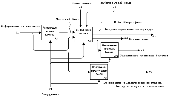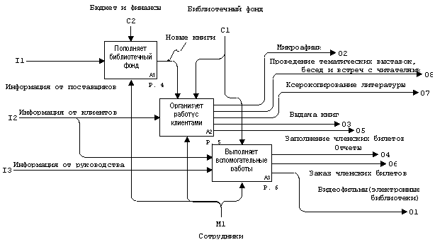Рис. — Взаимосвязь «выход-механизм» Поскольку содержание IDEF0 Диаграмм уточняется в ходе моделирования постепенно, Дуги на Диаграммах редко изображают один объект. Чаще всего они отображают определенный набор объектов и могут иметь множество начальных точек (источников) и определенное количество конечных точек (приемников). В ходе разработки графической Диаграммы для отражения этой особенности используют механизм разветвления/слияния Дуг. Это позволяет не только уточнить с использованием Замечаний содержание каждой ветви разветвленной Дуги (потока объектов), но и более точно описать из каких наборов объектов состоит входящая в функциональный Блок Дуга, если она получена путем слияния. Пример Рассмотрим немного надуманный пример системы — некоторый отдел контроля, созданный для оценки эффективности управления и функционирования библиотеки (с равным успехом, можно было бы также рассмотреть отдел финансового контроля на некотором предприятии, налогового контроля и т.п.).