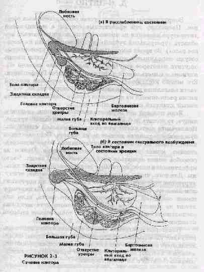 В. ГОЛОВКА КЛИТОРА В своей верхней части малые срамные губы соединяются вместе, образуя кожную складку, которая защищает головку клитора. Обычно при отсутствии эрекции головка клитора гнездится под этой кожной складкой (рис. 2-3 (а)). Вы можете увидеть головку, оттянув назад складку. Головка клитора насыщена нервными окончаниями, и для большинства женщин она является наиболее чувствительным местом в области половых органов. Некоторые женщины находят, что это место так чувствительно, что его прямая стимуляция может вызвать раздражение. Тело клитора ощущается как упругая резиновая полоска под поверхностью кожи между головкой клитора и лобком. По мере увеличения сексуального возбуждения тело клитора утолщается и укорачивается, а головка, тело и поддерживающие их структуры выпрямляются. Так же, как и у мужчины, при этом могут происходить существенные изменения размеров и формы (рис. 2-3(6)). Некоторые женщины считают, что при продолжительном интенсивном возбуждении разбухшие малые губы могут почти полностью скрыть головку клитора.