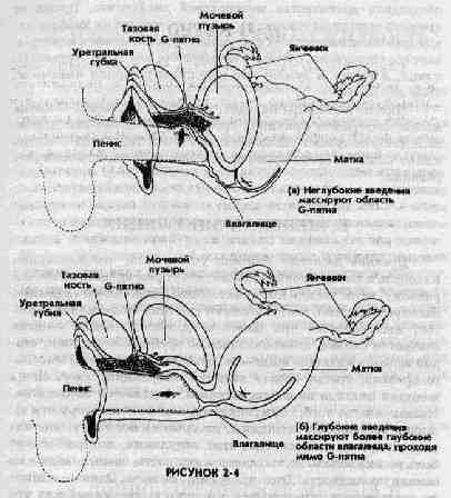 Д. G-ПЯТНО Вокруг уретры находится густая сеть кровеносных сосудов. Поскольку эти кровеносные сосуды в медицинской литературе названия не имеют, группа женщин назвала эту область "уретральной губкой" (см. "Новый взгляд на женское тело"). Во время сексуального возбуждения кровеносные сосуды наполняются кровью, и через стенку матки можно ощутить некоторое вздутие. Это вздутие было названо "G-пятном" - в честь одного из первых сексологов Графенберга. Его можно исследовать наощупь вокруг передней верхней части влагалища изнутри влагалища. (Говорят также, что G-пятно расположено на полдюйма глубже, чем может достать самый длинный палец женщины.) Если половой акт осуществляется в позиции "лицом к лицу", то достать до G-пятна половым членом бывает трудно. Исключение составляют мужчины, чей половой член в возбужденном состоянии достает до их живота. Если женщина хочет, чтобы ее G-ПЯТНО стимулировалось более непосредственно, может потребоваться смена позиции. Одним из способов может оказаться ввод полового члена сзади. Часто эффективное и непосредственное воздействие оказывают пальцы. Для того, чтобы лучше добраться до этого места, стимулирующая себя женщина может выбрать позу на корточках или лежа на спине с поднятыми вверх ногами. Ее партнеру может оказаться легче достигнуть этого места, если она лежит на животе. Если во время полового акта женщина расположена сверху, то она довольно точно может выбрать позицию для такой стимуляции (рис. 2-4 (а) и (б)). Некоторые женщины, крепко обнимая своего партнера, получают удовольствие от ощущения полового члена, надавливающего на нижнюю часть их живота, непосредственно над лобковой костью, поскольку при этом происходит стимулирование G-пятна с внешней стороны. Часто во время массажа G-пятна первым ощущением женщины является желание помочиться. Сексологи убеждают женщин, что если давление на G-ПЯТНО будет продолжаться, то это желание перейдет в сексуальное возбуждение. Один из моих студентов рассказывал: "Когда я работал в клинике, наблюдающей женщин, мы всегда довольно бурно обсуждали достоинства мочеполовой диафрагмы. Время от времени женщины говорили нам, что им мешает их диафрагма, которая вмешивается в их сексуальное удовольствие и перекрывает все ощущения. Это было еще до того, как было открыто G-пятно, и теперь я думаю, что женщины говорили именно об этом явлении". Многие женщины находят, что стимулирование G-пятна может послужить причиной оргазма, в то время как другие женщины получают удовольствие от стимулирования G-пятна как от части более обширной процедуры сексуального стимулирования.
