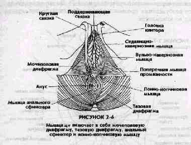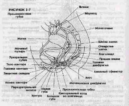 И. ПРОМЕЖНОСТНАЯ ГУБКА Внутри задней части входа во влагалище имеется еще одна наполненная кровеносными сосудами область, называемая "промежностной губкой" (рис. 2-7). Во время сексуального возбуждения промежностная губка утолщается, сужая вход во влагалище.