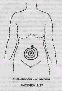 (1) ЗАКРУЧИВАНИЕ ЭНЕРГИИ СПИРАЛЬЮ ВОКРУГ ПУПОЧНОГО ЦЕНТРА Чтобы собрать энергию яичников, сконцентрируйте внимание на области пупка, расположенной в теле на глубине около полутора дюймов. Используйте ум, глаза и другие органы чувств, чтобы мысленно вводить энергию в эту область и выводить ее из нее, закручивая энергию спиралью вокруг пупка и делая при этом 36 оборотов. Не организовывайте спирали вокруг грудной диафрагмы или вокруг лобковой кости. Начинайте раскручивать спираль против часовой стрелки (рис. 5-27(а)). Затем измените направление закручивания спирали и приведите энергию обратно в пупок, делая почасовой стрелке 24 оборота (рис. 5-27(6)). Первые несколько раз используйте в качестве направляющей свой собственный палец. Теперь энергия надежно и безопасно хранится в вашем пупке, доступная для использования каждый раз, когда ваше тело нуждается в ней.
