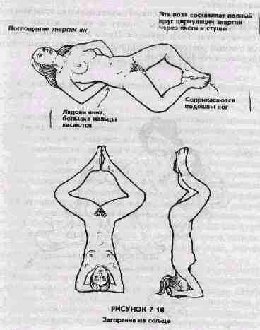 Если вам посчастливилось иметь частный, открытый солнцу участок, то вы, вероятно, получите удовольствие от этой практики. Солнечная энергия является весьма целительной и успокаивающей для половых органов и может быть поглощена через них яичниками. Лучшим временем дня является раннее утро (между семью и девятью часами) и вторая половина дня (между тремя и пятью часами). Сначала загорать следует не более пяти минут; постепенно это время доводится до десяти минут. Массируйте лобок и область вдоль больших срамных губ. Раскройте половые губы солнцу и силой мысли ведите солнечную энергию в яичники. Пусть эта энергия смешивается с вашей собственной энергией, которую вы вращаете по Микрокосмической орбите.