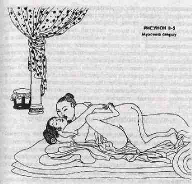 Эта позиция является самой обычной при занятиях любовью. Женщина лежит на спине с расставленными ногами. Для того чтобы поднять свой таз, она может подложить под ягодицы подушечку. Мужчина лежит на женщине или поддерживает часть своего веса или весь вес при помощи локтей, кистей рук или коленей. Не забывайте даосскую теорию: мужчина подобен огню, женщина подобна воде. Огонь легко зажечь, или его легче активизировать; он легко горит - так же, как большинство мужчин обычно сначала становятся сексуально активными и кажутся агрессивными. Женщина, подобно воде, может быть сначала пассивной, и обычно требуется, чтобы во время занятий любовью ее двигал мужчина. Поэтому в начале занятий любовью удобно, чтобы женщина лежала на спине, а мужчина был бы активным в предварительной игре, чтобы довести женщину до "точки кипения". Когда женщина становится активной и возбужденной, она также должна принимать в игре активное, или агрессивное, участие, целуя своего партнера, играя с его языком и ушами, держа и массируя его пенис. Все эти действия создают ощущение гармонии. Обычно пара начинает с основной позиции, затем продолжает в другой позиции и, что наиболее вероятно, заканчивает также в основной позиции с мужчиной сверху.