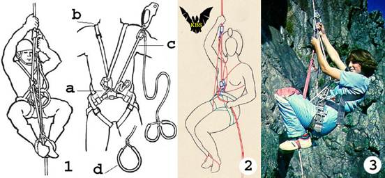 Рис.26 Способ подъема "Дэд" ("Frog") 1 - по материалам сайта фирмы "On Pope 1" by Bruce Smith a - беседка с низко расположенной точкой подвески b - ремень подтяжки кроля c - длинный ус с креплением ведущего зажима и педали d - педаль со стременем для двух или одной ноги 2 - мой рисунок по материалам (Marbach, G. and Rocourt, J.-L., Techniques de la Speleologie Alpine, 1980) - единая педаль на две ступни. 3 - Алина Гаузштейн, Усть-Каменогорск, на съемках учебного фильма, 1987 год