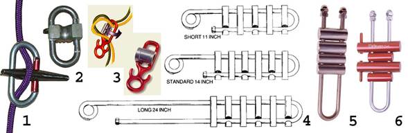 Рис.54 Развитие спусковых устройств на основе "Тормозящей перекладины" - "Brake Bar" 1 - импровизированный "Брэйк-бар" из карабина и скального крюка. 2 - представитель первых спелеологических "Брэйк-бар" на карабине (фото 1,2 из коллекции Gary D.Storrick) 3 - "Robot" фирмы "Kong" - сочетание тормозящей перекладины и "восьмерки" 4 - Предложенные Колом варианты "Rappel Rack" - короткий, стандартный и длинный (рисунок by Pandra Williams из книги "On Rope" by Allen Padgett and Bruce Smith) 5 - стандартная решетка "Minirack" сохранила свои черты и в 2005 году 6 - решетка "Giperrack" американской фирмы "CMI".