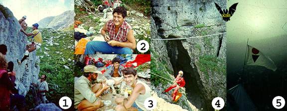 Рис.60 Вторая в СССР и по случаю Первая международная SRT-экспедиция "Снежная-1986". 1 - Камен Бонев и Розалин демонстрируют технику SRT на поляне Сувенир. 2 - руководитель болгарской пятерки Орлин Атанасов, София. 3 - болгарский лагерь в Логове, слева направо - Константин Серафимов, Камен Бонев, Филип Филиппов и добрый болгарский коньяк. 4 - Константин Серафимов в болгарском снаряжении на спуске в Снежную. 5 - флаг клуба "Сумган" в облаках под Хипстой.