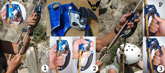 Рис.90 Самостраховочный эксцентриковый зажим "Reflеx-ExS" на основе пуани Петцля. 1 - ведение указательным пальцем 2 - ведение безымянным пальцем 3 - возможность воздействия на рычажок "Рефлекса" большим пальцем при подъеме