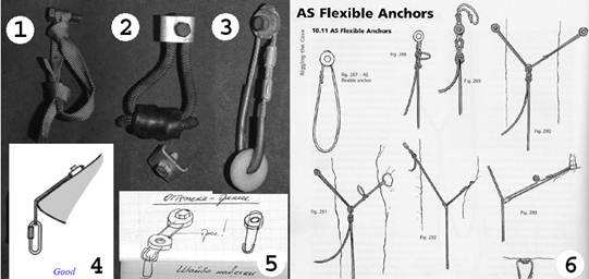 Рис.91 Эволюция крючьевых удлинителей бескарабинной навески. 1 - "Петля героя" (Hero Loop). 2 - Гнутая шайба (Bent Washer) и удлинитель из шнура на ее основе. 3 - французский тросовый удлинитель СAT (Cable Amarrage TSA). 4 - правило использования САТ при навеске. (рисунки 1,2,3,4, из книги "Vertical" by Alan Warild) 5 - мой рисунок "Оттяжка-трение-трос!" и "Шайба навески" из дневника "Каунас-83". 6 - современные AS (Amarrages Souples) из 5-мм шнура Дайнима (Спектра) (иллюстрация из книги "Alpine Caving Techniques" by Georges Marbach and Bernard Tourte)