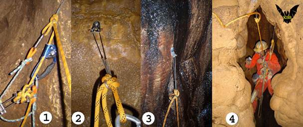 Рис.93 Тросовые уши-удлинители Азиатской школы SRT и применение Шкотового узла, 2004 г. 1 - петелька шкотового узла на тросовом ушке - прекрасная точка самостраховки при проходе через промежуточное закрепление. 2 - тросовый удлинитель позволяет забивать крючья в удобные места с гарантией отсутствия трения узла закрепления. 3 - удлинитель прекрасно отрывает узел от скалы. 4 - Константин Серафимов прокладывает навеску на тросовых ушках.