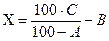 X - необходимое количество воды, г А - заданная влажность теста, % В - масса закладываемого сырья в натуре, г С - масса сырья в сухих веществах, г